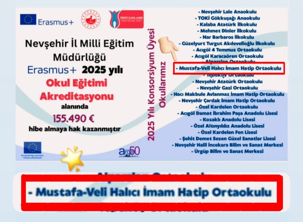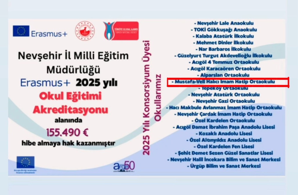 Ürgüp ilçesinde akredite olan tek ortaokul olmanın heyecanını ve gururunu yaşamaktayız. Okulumuz, aldığı eTwinning Kalite Ödülü ile ulusal ve uluslararası alanda kendini kanıtladıktan sonra, şimdi de Erasmus 2025 Yılı Okul Eğitimi Akreditasyonunu almaya hak kazandı.